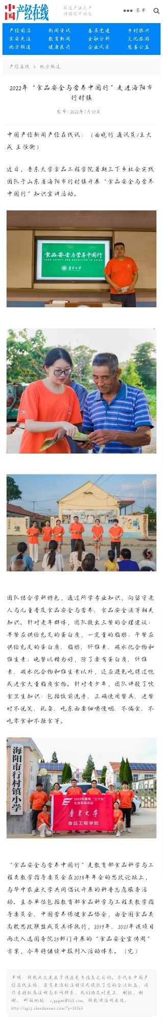 近日,鲁东大学食品工程学院暑期三下乡社会实践团队于山东省海阳市行村镇开展“食品安全与营养中国行”知识宣讲活动。
