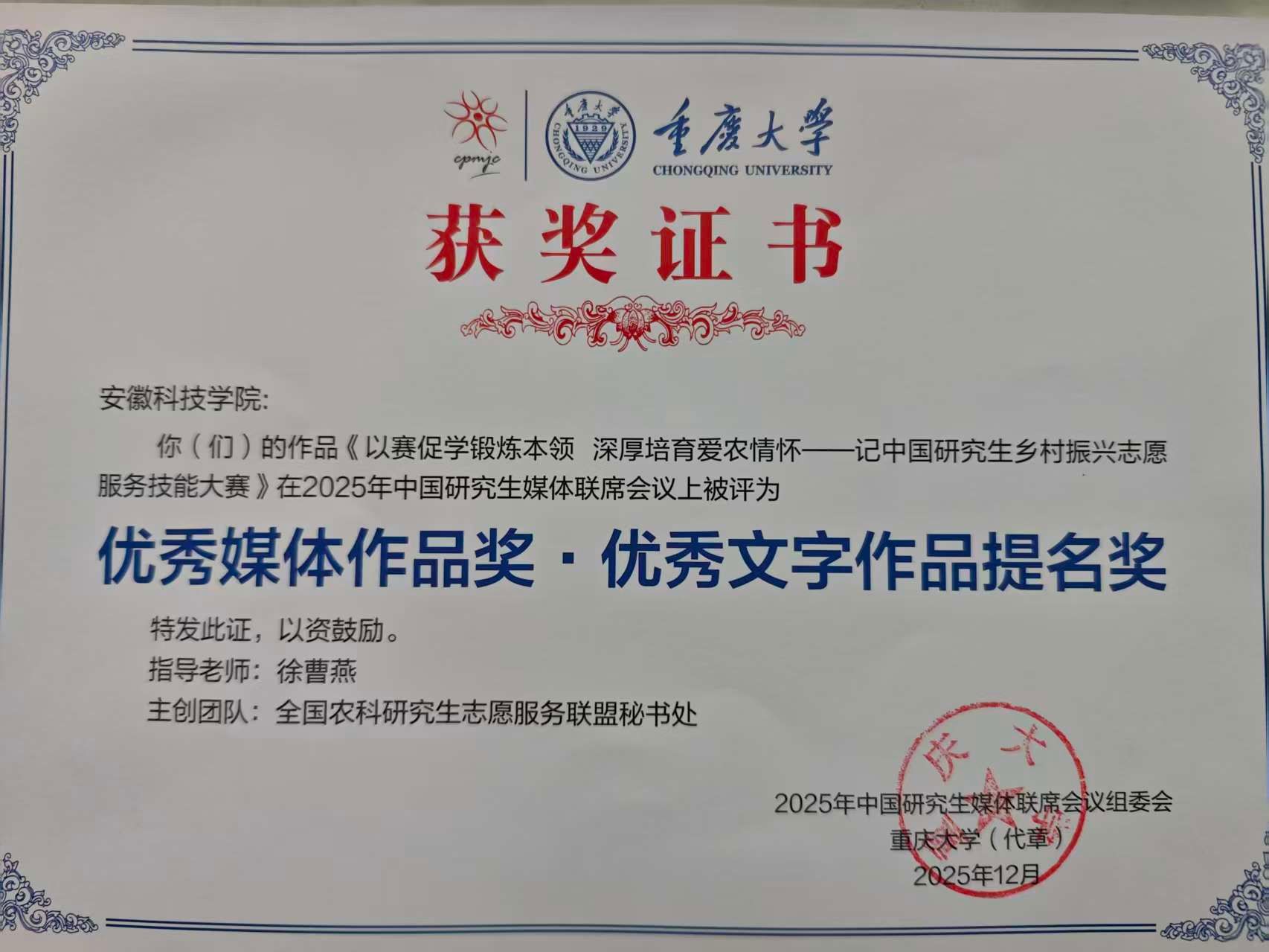 作为全国农科研究生志愿服务领域的重要组织,全国农科研究生志愿服务联盟首次组织代表参会。由联盟秘书处精心撰写的作品《以赛促学锻炼本领 深厚培育爱农情怀——记中国研究生乡村振兴志愿服务技能大赛》,经多轮评审,最终斩获 “优秀文字作品提名奖”,这既实现联盟在全国研究生媒体领域的奖项突破,更彰显安徽科技学院作为联盟常任主席单位及秘书处挂靠单位创设并运营联盟公众号、支撑联盟秘书处工作的扎实成效。