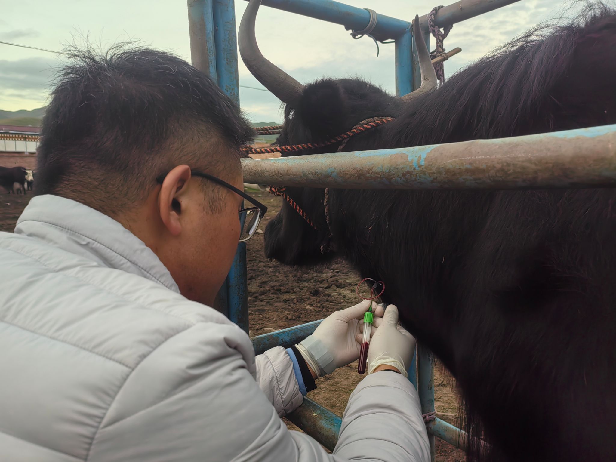 王军乾正在开展初生期犊牛的护理工作和孕牛血液样品的采集工作